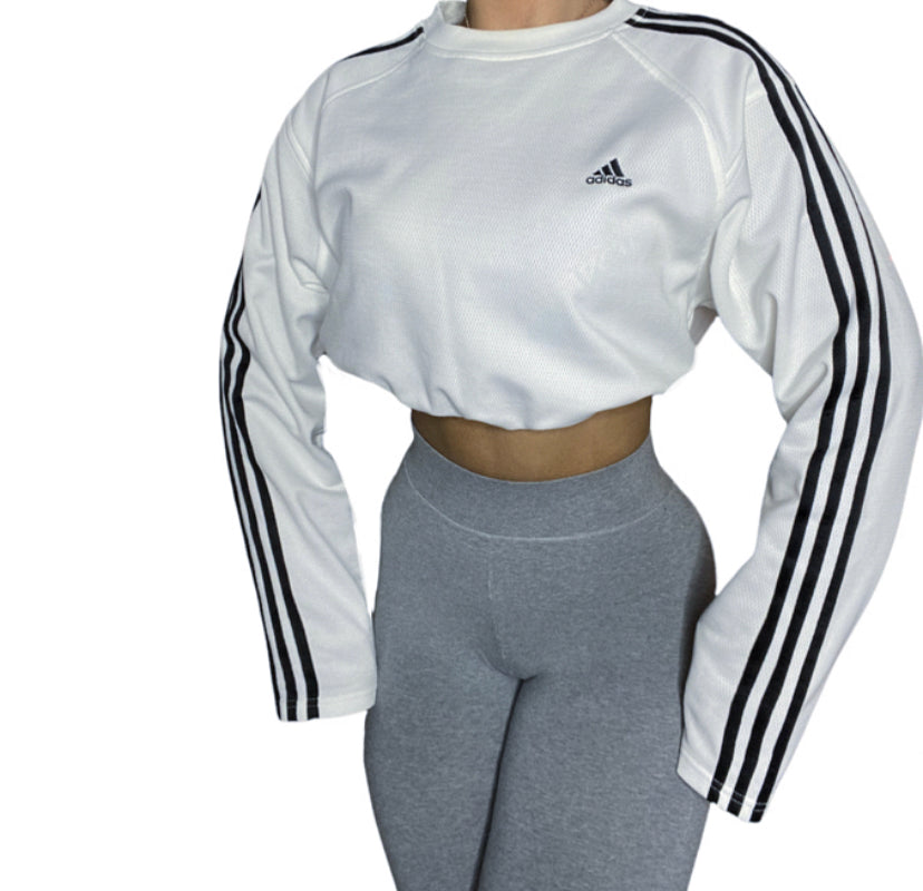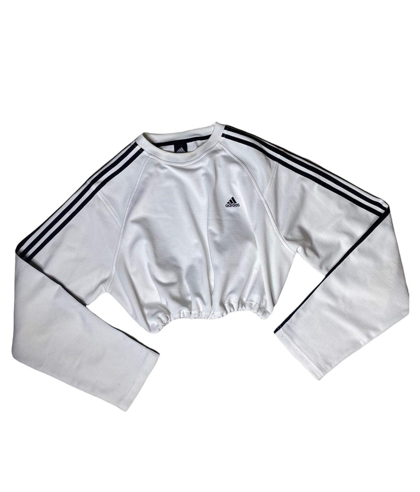 Reworked Adidas Long-sleeve Crop Top - white with black three stripes - elastic waist band